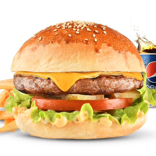 Lezzet Şöleni: Cheese Burger Menü! Özel öküz burger köftesi ve dilim dilim cheddar peyniriyle muhteşem bir uyum sağlıyor. Yanında anne patates ve sınırsız içecekle lezzetin doruklarına